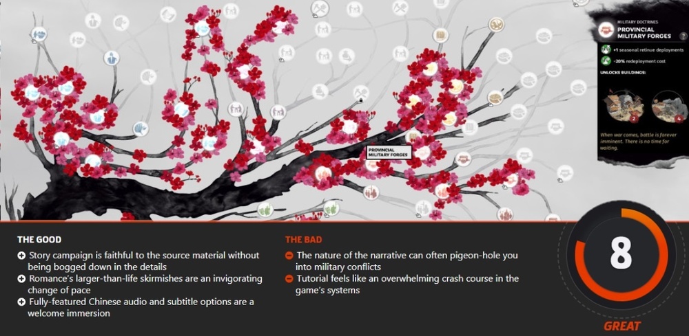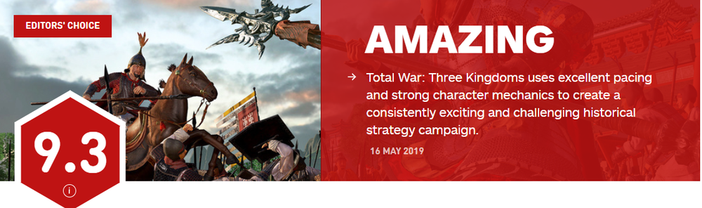 给出了满分的 Wccftech 更表示游戏太过让人上瘾,让评测者把大把时间都投入到了游戏里,游戏在各方各面都找到完美的平衡,更让《全面战争:三国》不仅成为几乎完美无缺的系列最佳,更是评测者心目中最好的游戏之一。