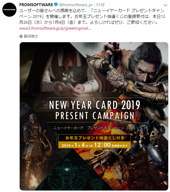 12月26日,FromSoftware 的官方社交账号发起了一个抽奖活动,幸运儿会获得一份来自 FS 的新年礼物,所有人都可以前往活动官网参加,并且只要参与就可以获得一份电子版的游戏主题海报。
