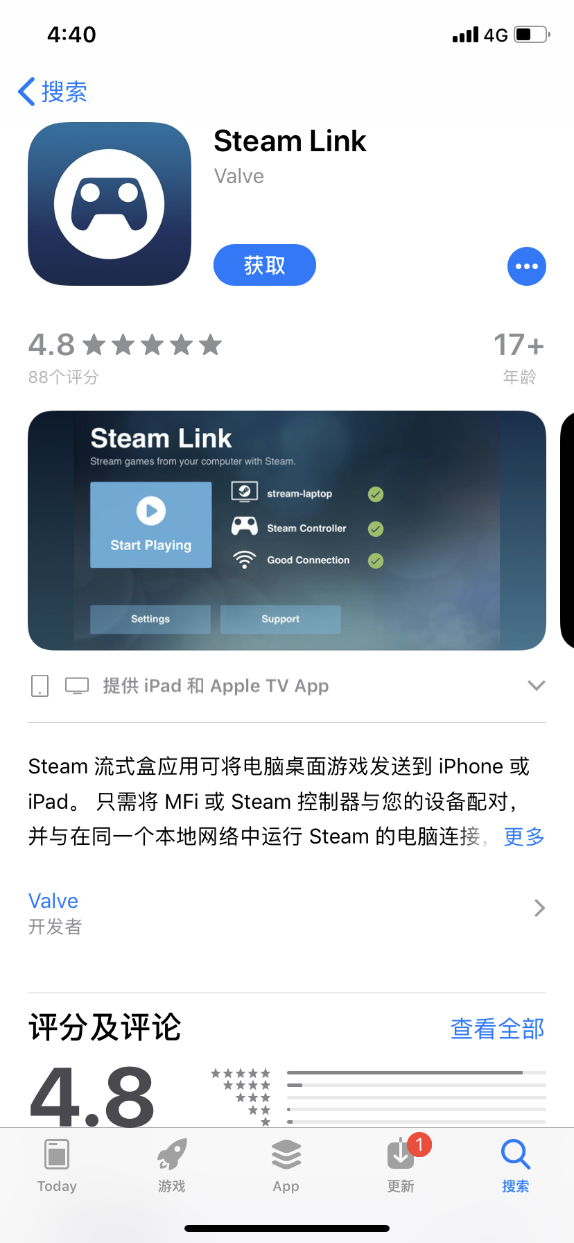 尽管 Google Play 上的安卓 Steam Link 已经经过多次更新而变得稳定可用,但 iOS 版却一直不见踪影,而这一切在今天发生改变了——苹果终于批准了V社的上架申请,iOS 上的玩家终于也可以躺着玩自己的3A大作了。