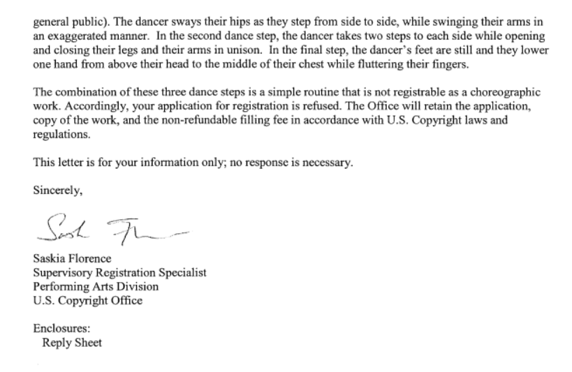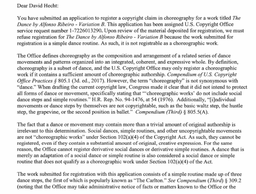 该文件还提到了这样一个事实,即尽管里贝罗说他创作了舞蹈这个动作,但他之前从未试图对其进行版权保护,“大概是因为他知道自己不拥有版权”,这对EPIC来说是个非常好的消息。