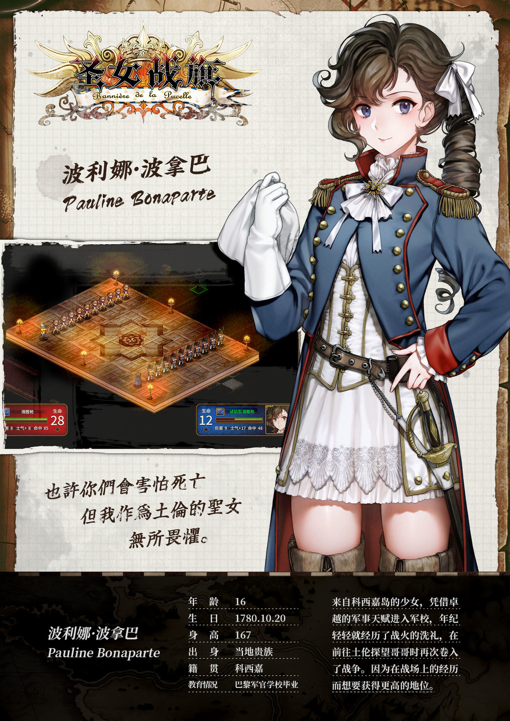 游戏采用经典的回合制战棋玩法,玩家将扮演拿破仑的妹妹波利娜•波拿巴指挥部队参与法国大革命时期的大小战役,书写属于自己的英雄故事。而且想要在当时的社会环境下立足,不仅仅要靠战场上的拼杀,玩家还需要周旋于法国上层社会,争取盟友和帮助。