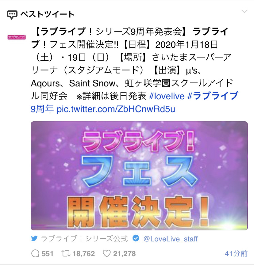 Lovelive!系列9周年发表会上公布了系列新 FES 的信息。2020年1月18日、19日两天,将在埼玉 super arena 举办演唱会。除了 Aqours、Saint Snow 和虹咲学园偶像同好会外,μ‘s 也将登场。具体信息将在后续公布,详情请见9周年网站。