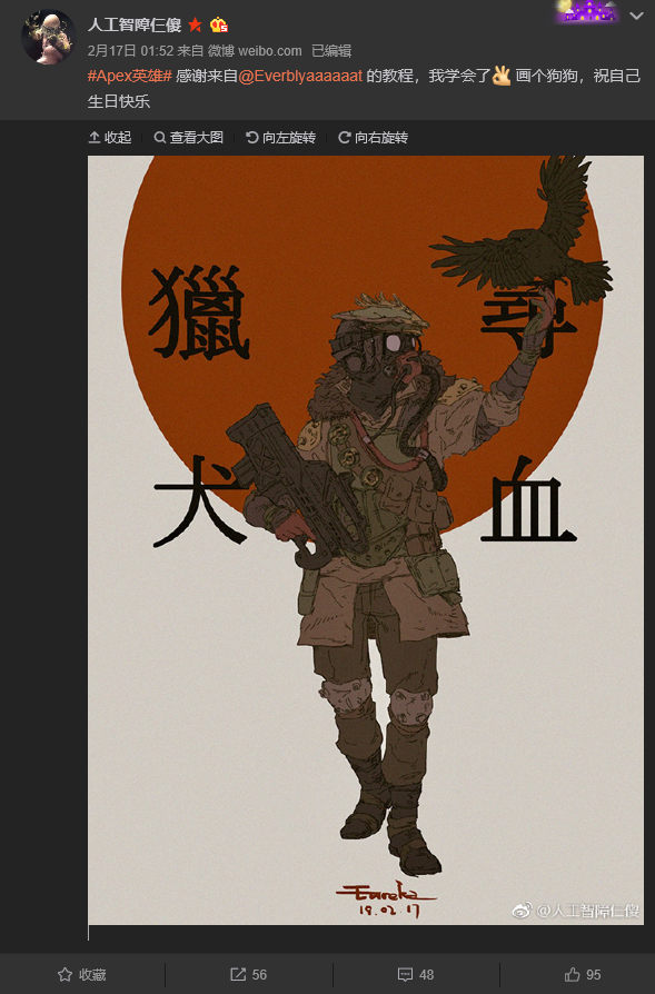 视频中不仅截取了 Twitch 主播们的精彩操作,还收录了一些同人作品。值得一提的是其中有一副寻血猎犬是自中国画手,微博@人工智障仨傻 小姐姐的创作。