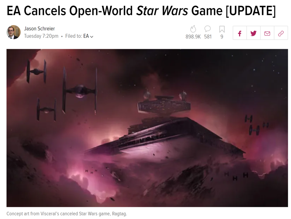 此前,据Kotaku报道称,EA已经取消了由Visceral工作室开发的,代号为“Orca”的《星球大战》开放时间新作,游戏中开发者原定设想是可以让玩家自由选择善恶,并在广阔开放的星际之间发生各种冒险。