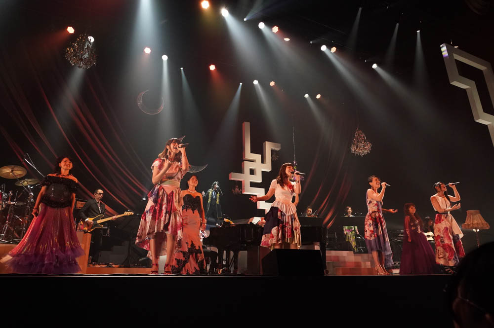 レギュラー歌姫が4人、3人、2人とフォーメーションを変えながら見事なコーラスワークを聞かせる中、ゲストヴォーカルの1番手として登場した戸丸が「lotus」「媛星」「目覚め」の3曲で、ビブラートを排した独特の歌声を響かせる。入れ替わるようにステージに上がったRemiは、「she has to overcome her fear」「Rainbow〜Main Theme〜」「moon and shadow」で美しいソプラノを披露。ライブ後半では、伊東えりが「Credens justitiam」「a song of storm and fire」「ring your song」で存在感のある歌声を聞かせると、笠原は「Point Zero」「the battle is to the strong」「salva nos」の3曲でオペラ出身らしい迫力ある歌唱を披露するなど、それぞれが持ち味をいかんなく発揮した。