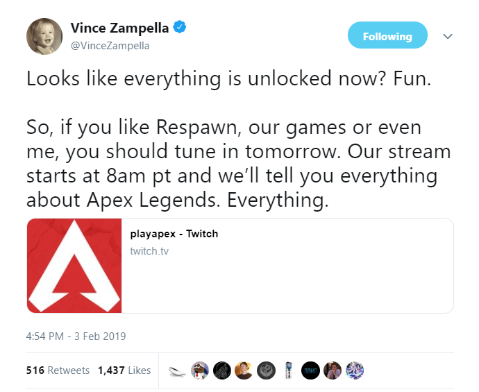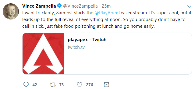 而在正式确认《Apex Legends》即将公布后,Vince Zampella 继续确认,今晚12点将仅仅是一个先导预告的直播,而在稍晚会有正式公布。