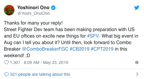 小野义德在推特上感谢了广大玩家对《街霸》游戏的支持,并表示目前《街霸5》制作组已经在与卡普空美国以及欧洲的相关部门一起,准备一些令人兴奋的内容。同时他也暗示会在8月份的某些大的活动上带来这些事情,关注格斗游戏的玩家们肯定知道,8月初正是 EVO 2019 举办的日子。