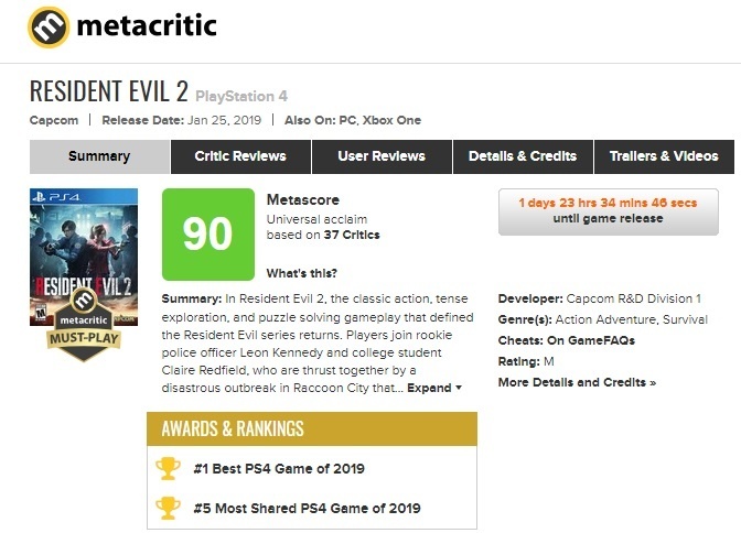 随着《生化危机2》发售接近,媒体评分也被解禁,诸多媒体已经给出了他们的评分,而且——截稿前Metacritic评分为90分,并获得了Metacritic的“不可不玩”评价(MUST-PLAY)。