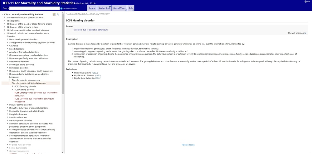 世界卫生组织(WHO)已经正式认定“游戏障碍(Gaming Disorder)”为一种疾病,将此条目收纳于“国际疾病分类”第11次更新版本(IDC-11)”中,“因滥用和成瘾行为而导致的精神障碍(Disorders due to substance use or addictive behaviours)”条目下“因成瘾行为而导致的精神障碍(Disorders due to addictive behaviours)”的分类里,与赌博成瘾而导致的精神障碍条目并列,编号:6C51。
