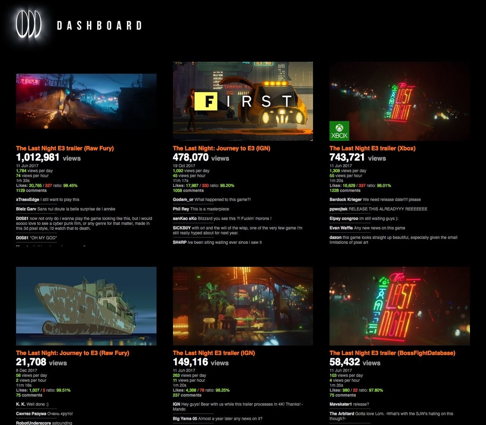 Tim Soret 还在推特上放出了此前《The Last Night》各部预告所取得的观看总量统计。另外目前在 Steam 商店页面上,已经总共186,000位用户将《The Last Night》列入了愿望清单。这连 Tim 自己都发出了“难以置信”的惊叹。