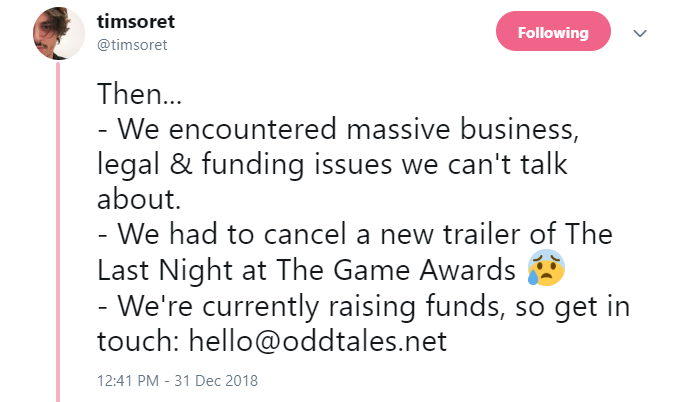 然而在2018年,为了制作《The Last Night》,开发组 Odd Tales 同样面临了不小的困难: