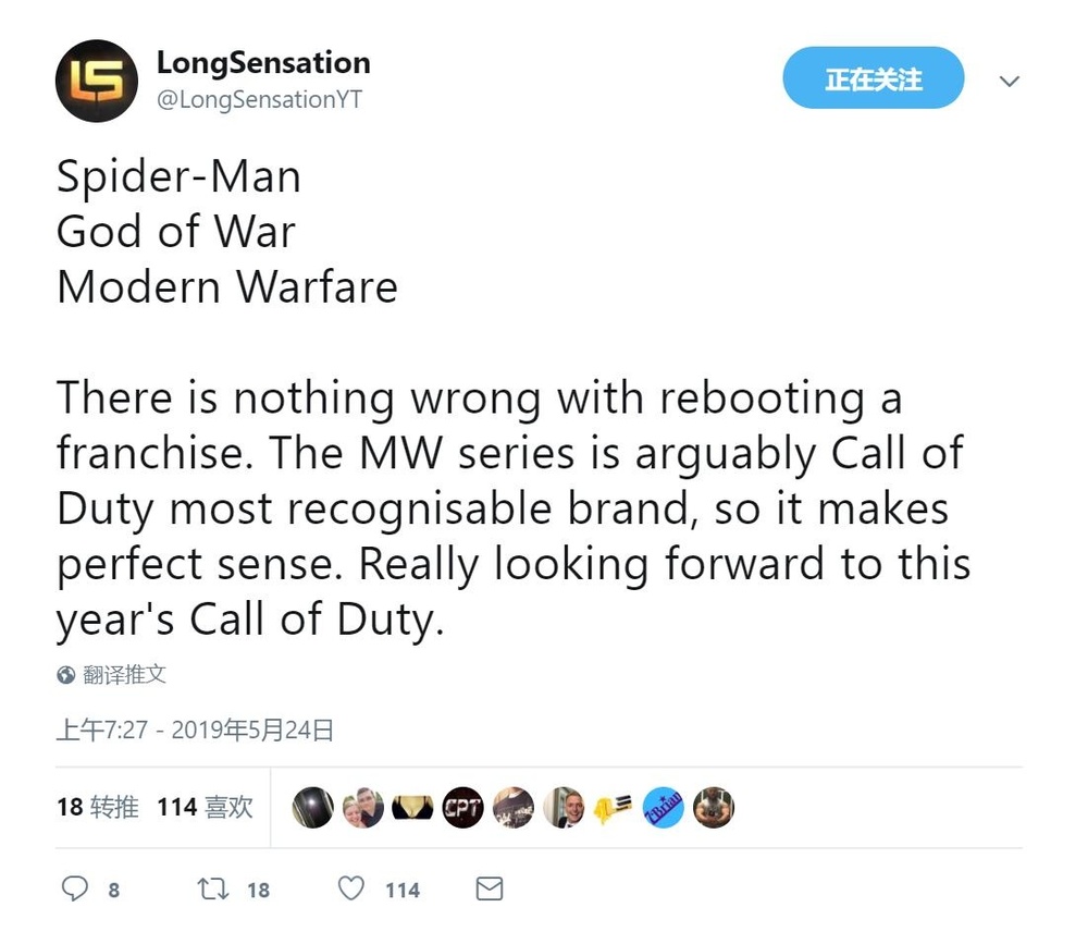 除了命名外,包括 Kotaku 在内的众多外媒都表示,《使命召唤:现代战争》是一部“软重启(soft reboot)”作品,并由 Infinity Ward 制作且在今年秋季发售。而最先爆料的 LongSensation 则在其推特上表示:“《蜘蛛侠》、《战神》和《现代战争》对于这些游戏来说,重启整个系列并没任何不妥。而且《现代战争》系列是《使命召唤》的金字招牌,所以这个时候进行重启工作完全是有意义而且十分令我期待的。”