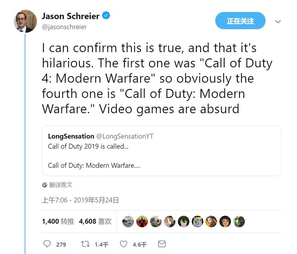 随后外媒 Kotaku 的主编 Jason Schreier 转推称该爆料属实。《现代战争》系列的第一作是《使命召唤4:现代战争》,所以《现代战争》系列的第四款游戏应为《使命召唤:现代战争》。另外他还表示“电子游戏都是荒谬的(Video games are absurd)”