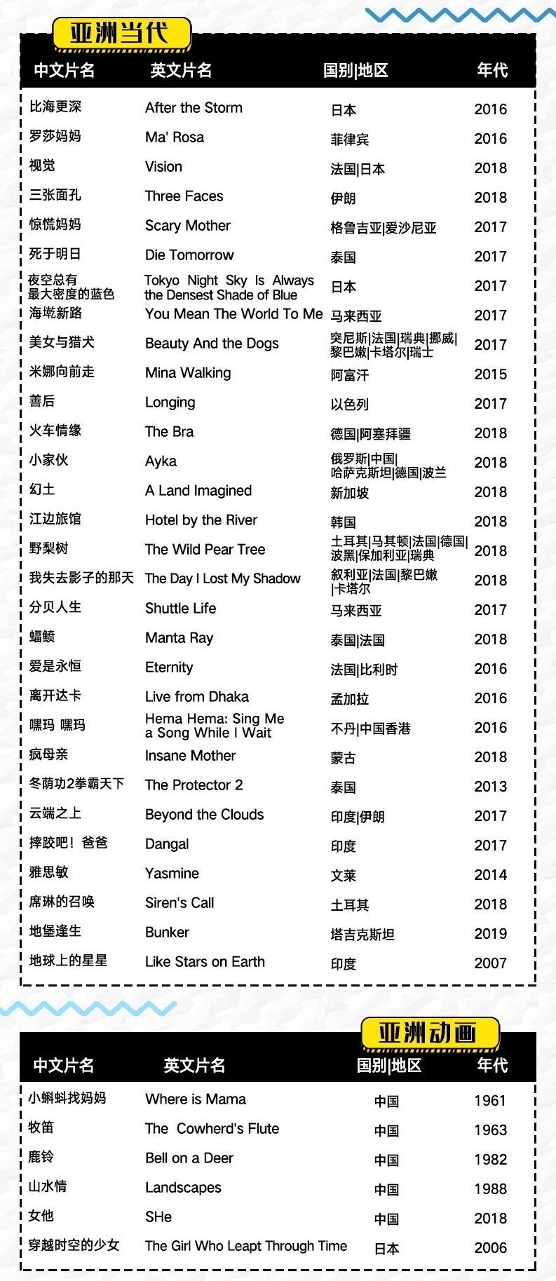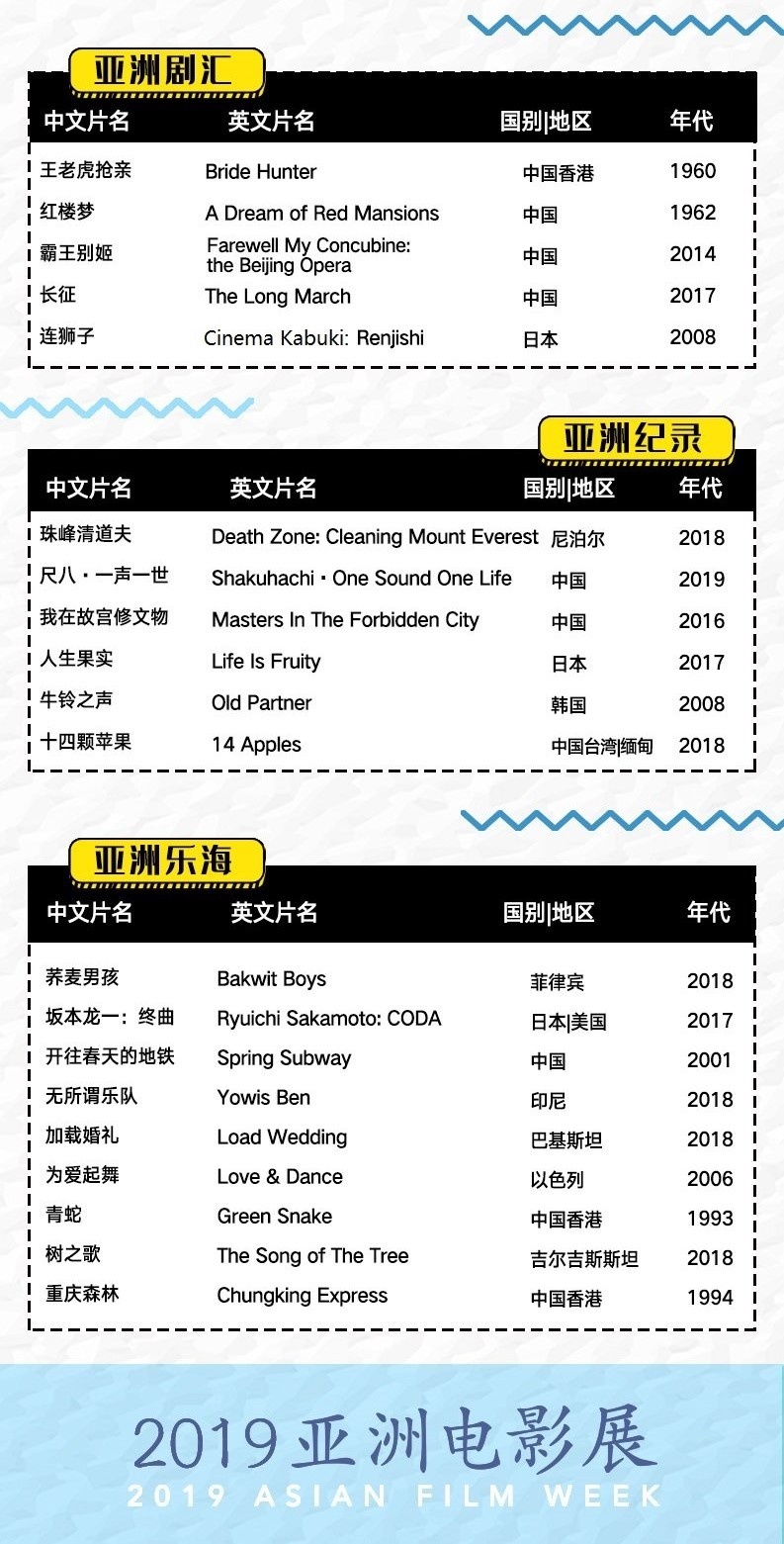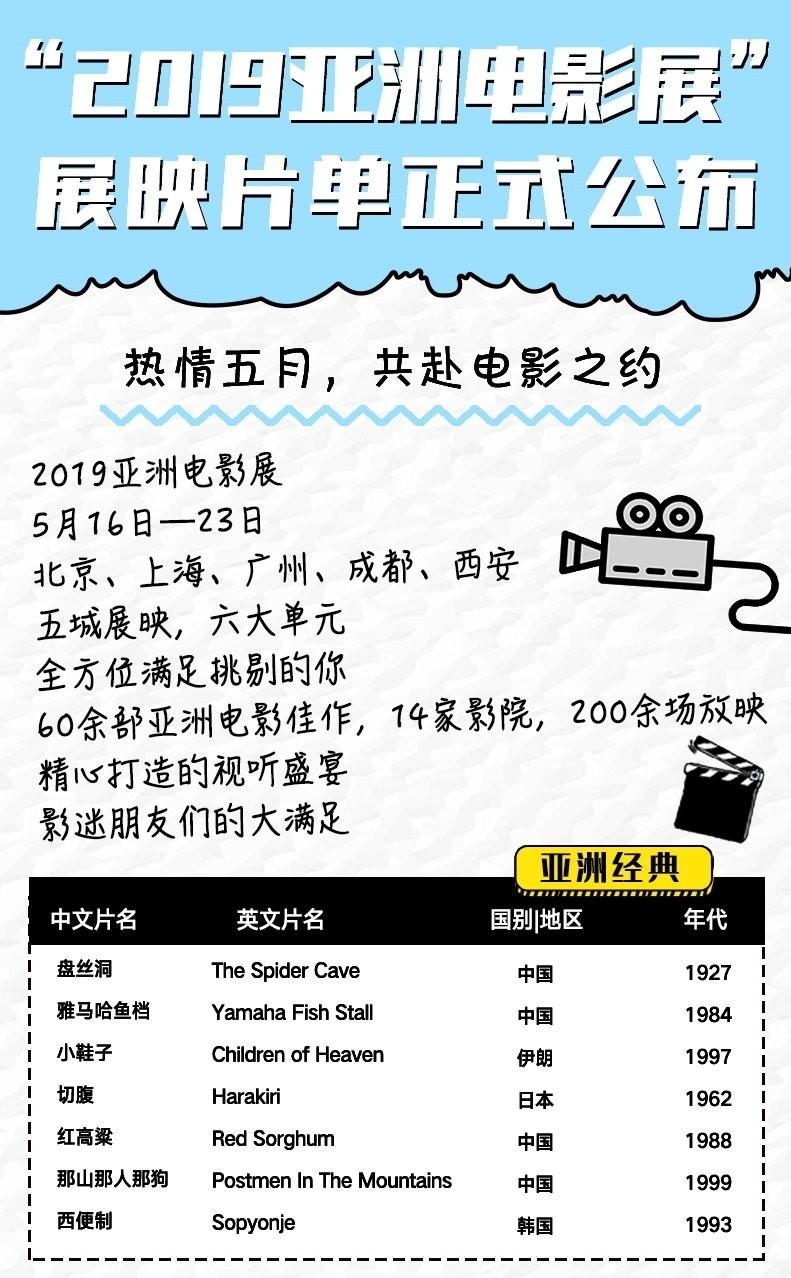 以“文明之光,银幕绽放”为主题的“2019亚洲电影展”将于5月16日至23日举办,届时在北京、上海、广州、成都、西安5座城市的14家影院将进行200余场放映活动。展映片单已于近日公布,共有来自亚洲30多个国家的60余部佳作入选,影展于5月13日中午12点整正式开票,购票平台为猫眼和淘票票。