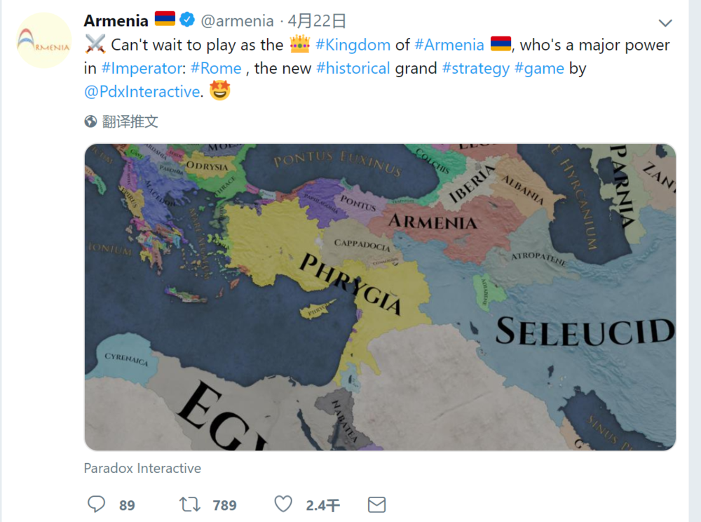 非常有趣的是,P社这次居然有国家政府帮助站台:4月22日,亚美尼亚政府的官方推特发表内容称:“迫不及待地想玩《统治者:罗马》里的亚美尼亚王国了!亚美尼亚在这款游戏里将会是主要势力之一。” 亚美尼亚王国(Kingdom of Armenia)是一个存在于公元前321年至428年的王国,除了提格兰二世于公元前83-66年独立外,其余时间都是罗马帝国与波斯的从属地区,最大疆域从里海伸延到东地中海的叙利亚。