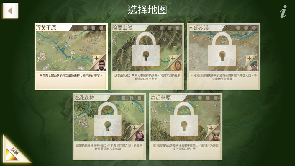 目前《反叛公司》共有 5 张地图,分别是“浑黄平原”、“险要山隘”、“南部沙漠”、“浅绿森林”与“边远草原”。随着游戏的进行,我们可以逐步解开全新的地图与拥有不同技能与特色的领导人。