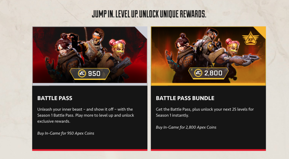 “战斗通行证”分为两个包,第一个通过升级解锁、获得每级的奖励,售价950 Apex币(约¥64)。第二个秒升前25级,并获得相关奖励,售价2800 Apex币(约¥188)。