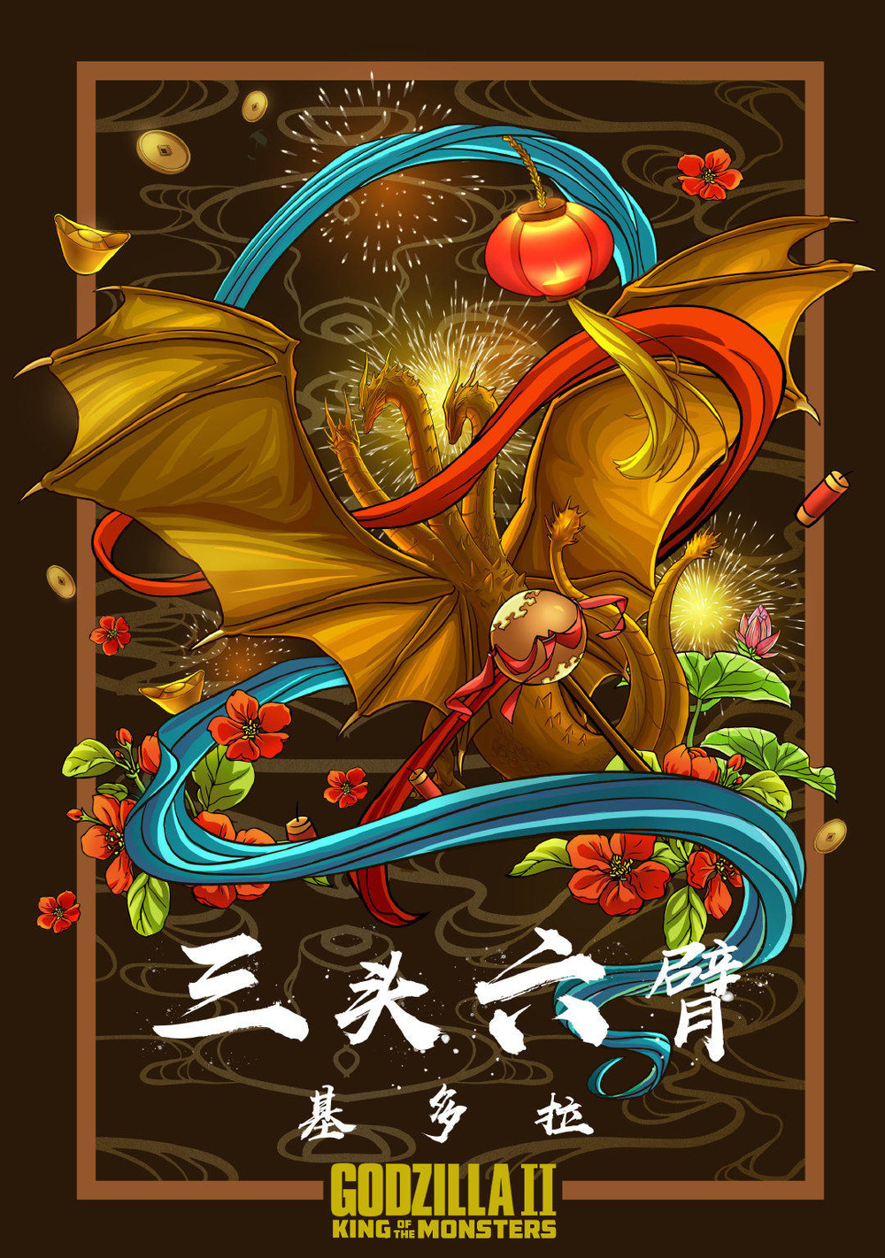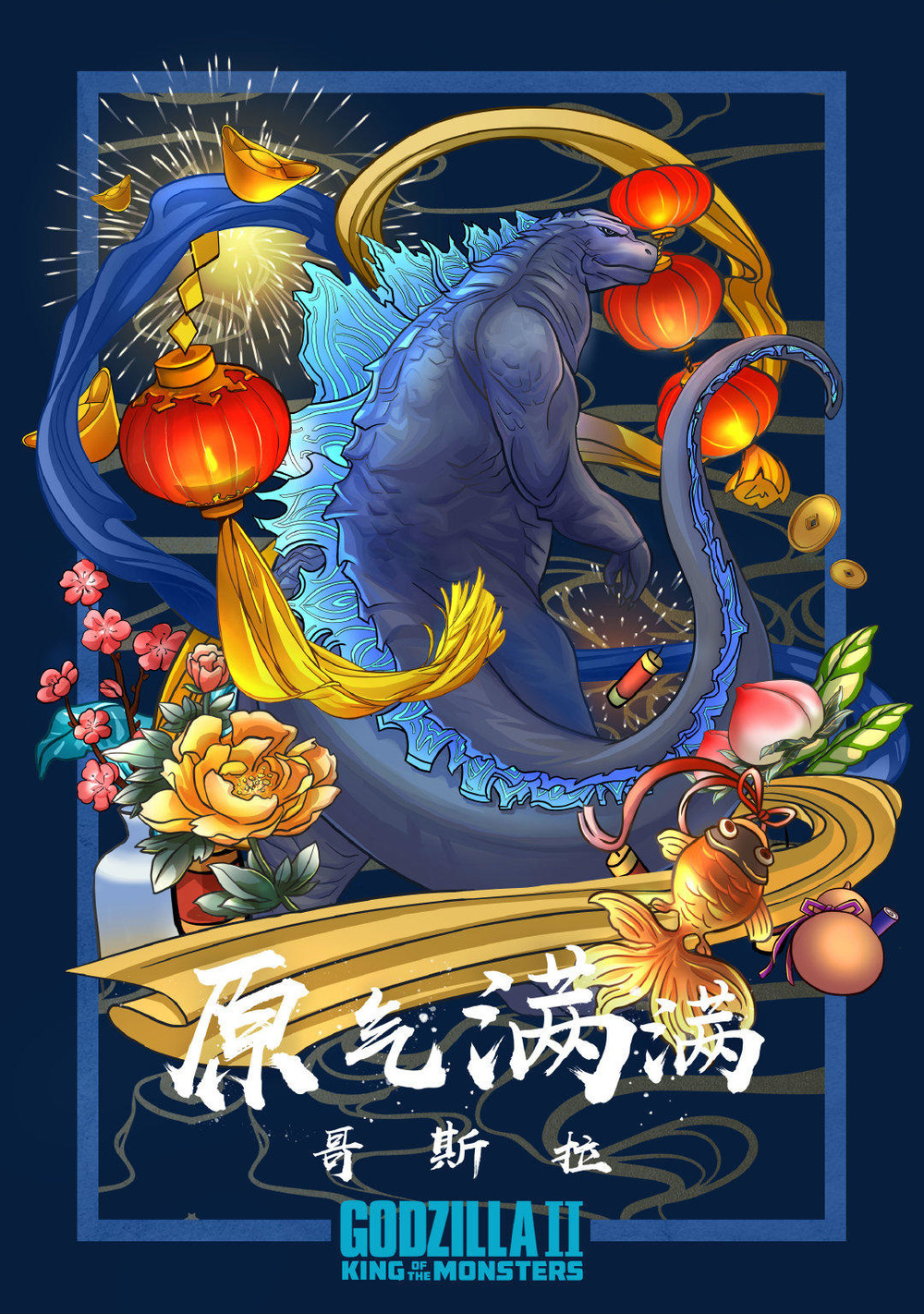 另外感受一下我在网上找到的《哥斯拉2:怪兽之王》的“中国风”海报,嗯,是“孙悟空大战铁血战士”的味道:
