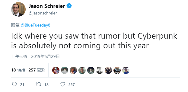 此外,经验丰富、曾准确提供无数传言(包括此前《死亡搁浅》发行时间)的 Kotaku 主编 Jason Schreier 表示,所有《赛博朋克2077》会在2019年发售的传言都不属实,这款游戏绝对不会(absolutely not)在今年发售。