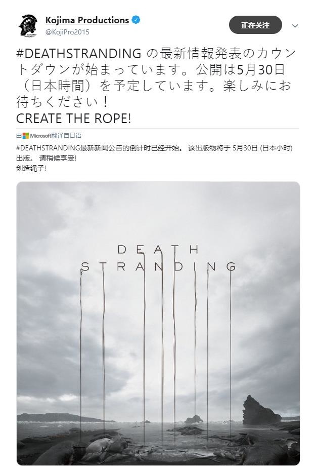 导语:小岛工作室(Kojima Productions)在其官方推特上宣布,将于日本时间5月30日公布《死亡搁浅》最新情报。