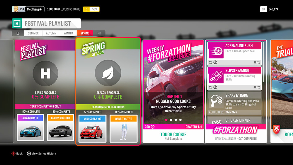 距离系列月活动的奖励结算仅剩一周时间,Alfa Giulia Forza Edition(50%系列月活动完成度)和Ford Crown Vic(80%)向大家招手。本周奖励是2009年Vauxhall Corsa(50%周活动完成度)和Rabbit Outfit(80%)。在#Forzathon商店,您可以用积分为自己车库增加2013款梅赛德斯 - 奔驰E 63 AMG,2011款Koenigsegg Agera等。