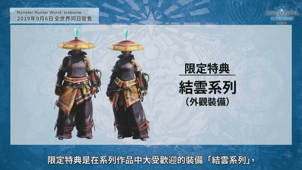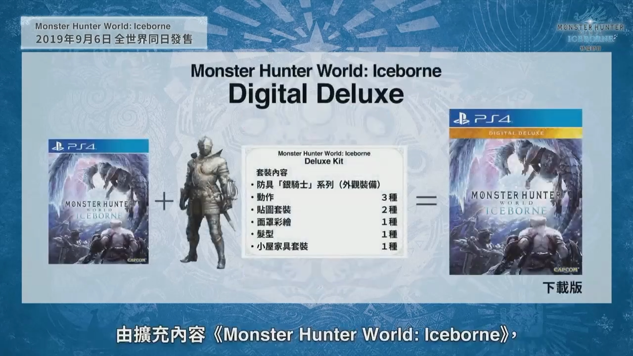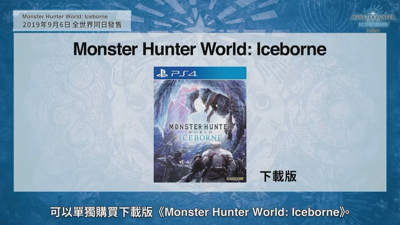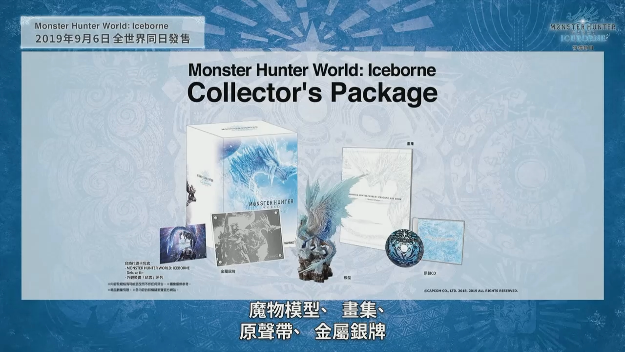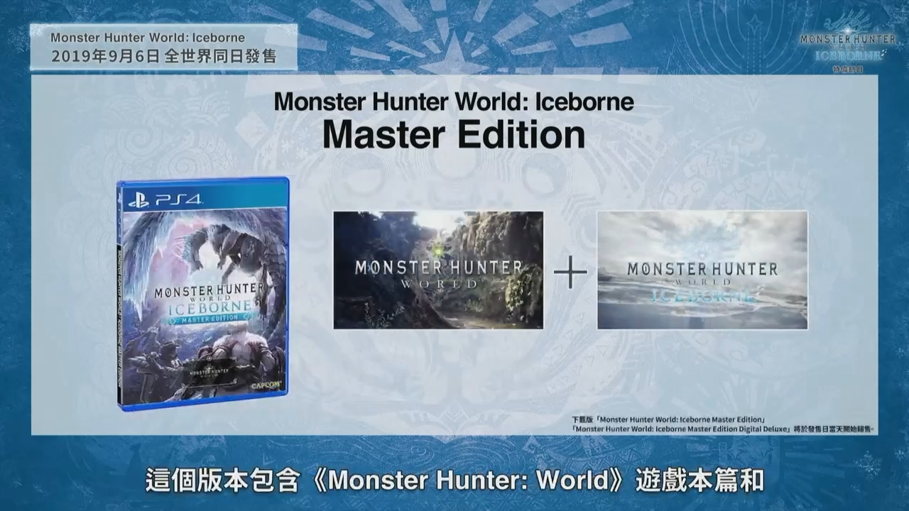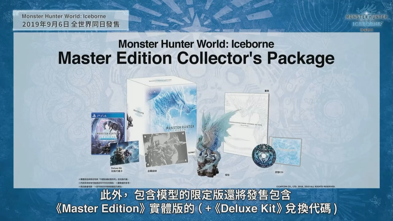 资料片《ICEBORNE》计划在9月6日全球同步推出,制作人辻本良三简要介绍了《ICEBORNE》各版本的发售情况。已经拥有《怪物猎人 世界》本篇的玩家可以单独购买《ICEBORNE》。还没有体验《怪物猎人 世界》的玩家也可以购买“大师版”,这个版本包含本篇以及《ICEBORNE》,限定特典则是结云套装。大型资料片《ICEBORNE》也会推出典藏版,包含游戏扩充内容、冰呪龙模型、原声带、画集以及金属银牌。