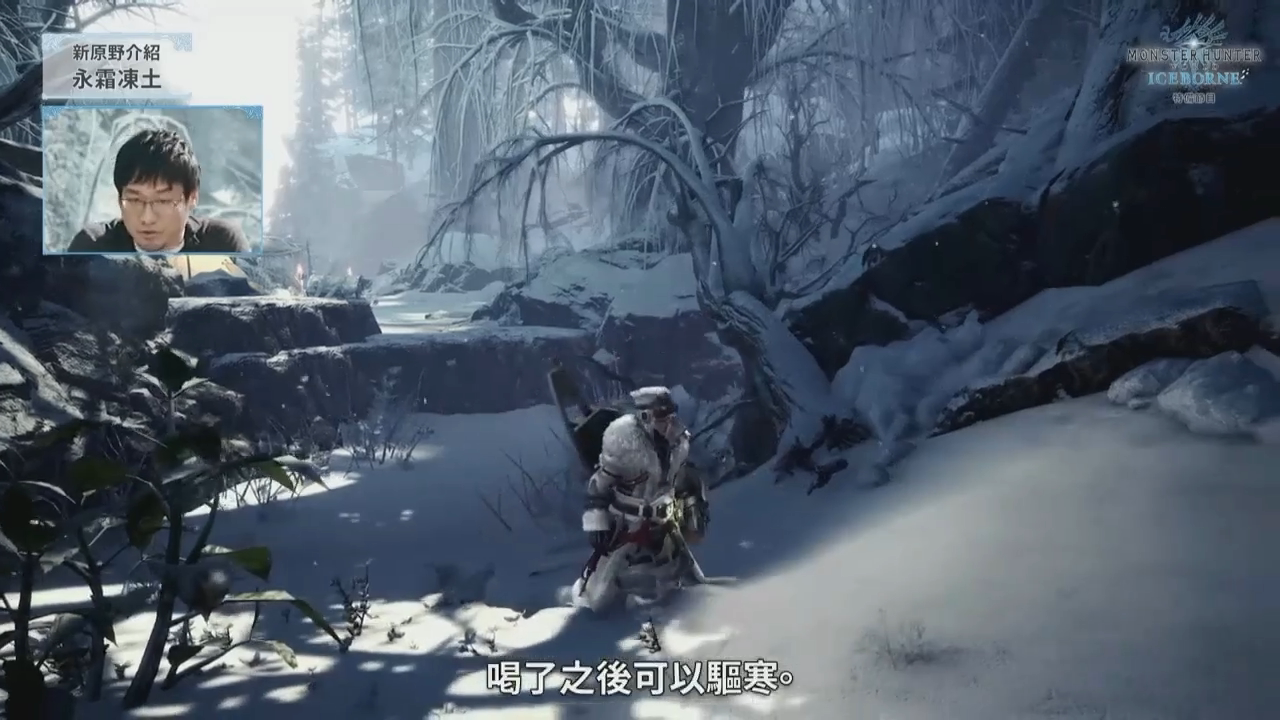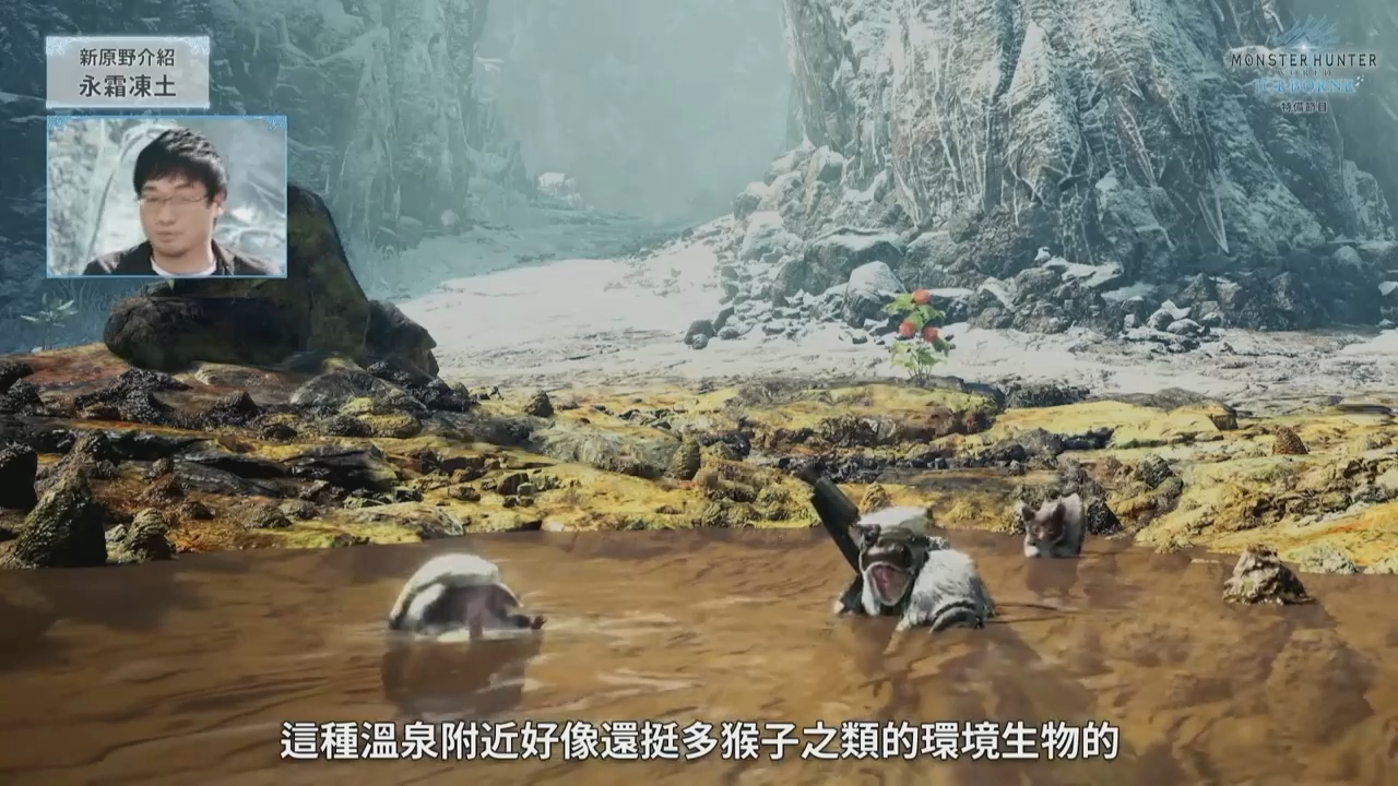 这一次的新区域是许多玩家强烈要求的寒地区域,名为「永霜冻土」。在画面表现上,这个区域较之以往有所加强,猎人在雪地中移动时的轨迹也做了出来,在一些细节方面开发团队很花心思。和《怪物猎人》以往的习惯一样,在寒冷地区时猎人的体力会有受到影响,喝热饮或者泡温泉的话都能驱寒。