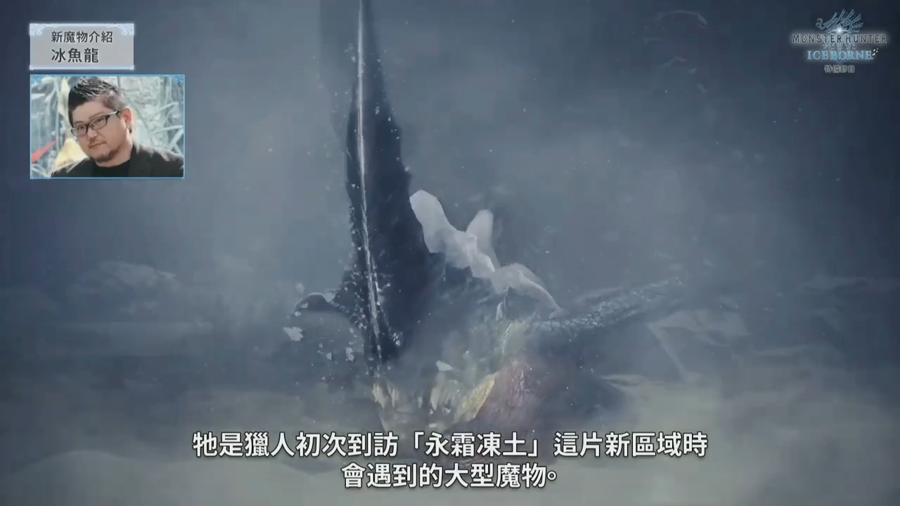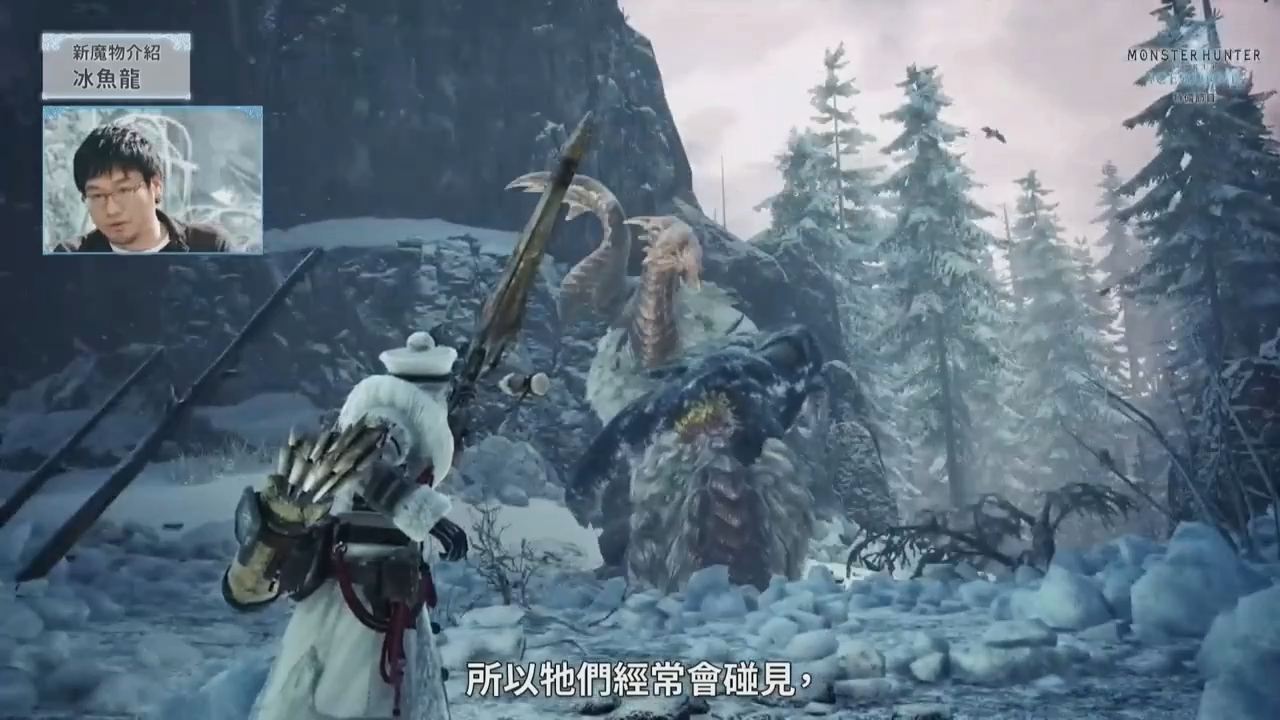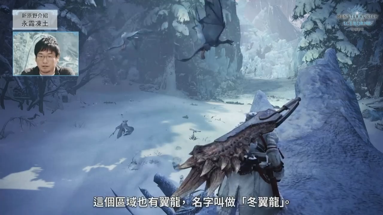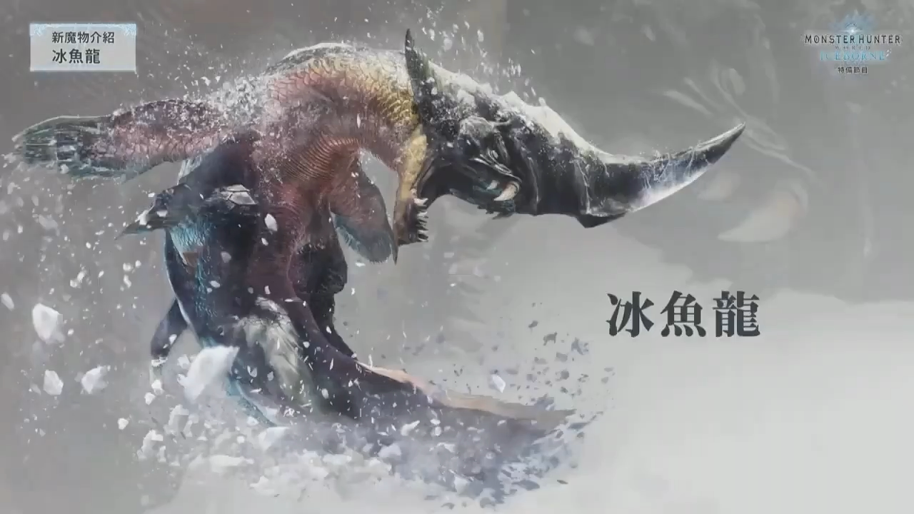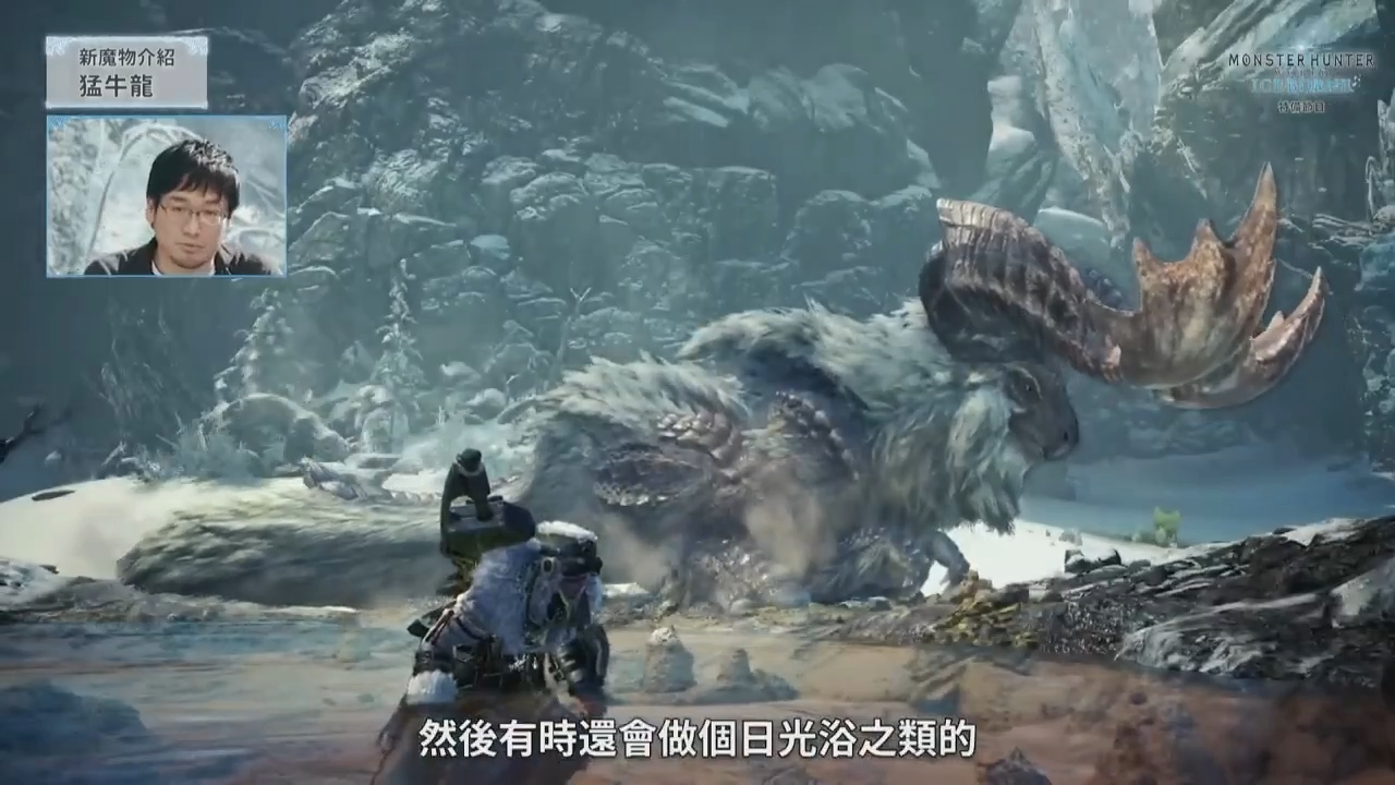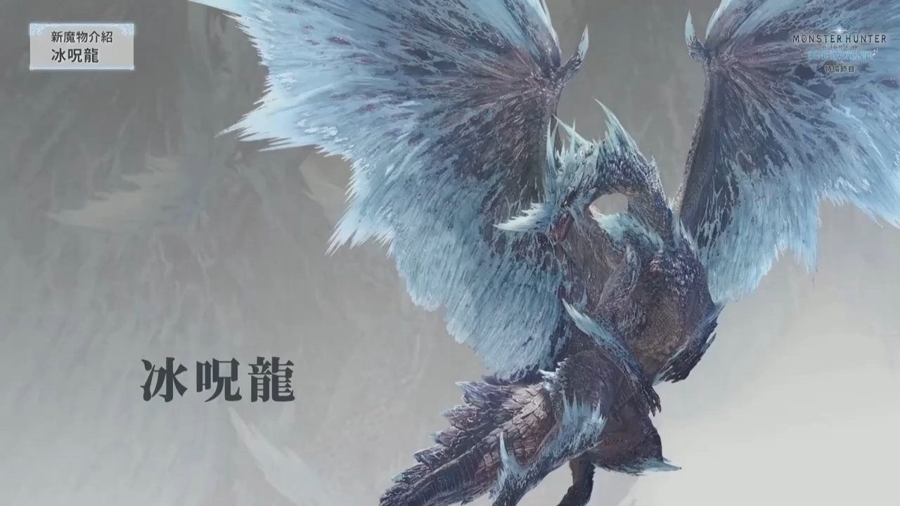 最后介绍的怪物「冰呪龙」是这次《ICEBORNE》的主题怪物,同样也是一只古龙,从天而降气势十足。因为冰呪龙是古龙种,所以相较于使用普通的冰系攻击,它更喜欢使用一些特殊的攻击手段。