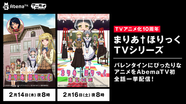 インターネットテレビ局「AbemaTV」にて、アニメ『まりあ†ほりっく』『まりあ†ほりっく あらいぶ』が全話一挙配信決定。バレンタインデーの特別企画として2月14日、16日、1日3回視聴可能となる。