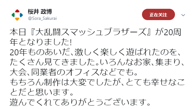 《任天堂明星大乱斗》系列今天20岁了!这20年来,我也见到了许多朋友在各种场合享受《大乱斗》的乐趣,不管是在家中还是在户外甚至是在办公室中。虽然开发过程总是伴随着各种各样的困难,但我依旧非常开心!真是特别感谢大家能够体验《大乱斗》。