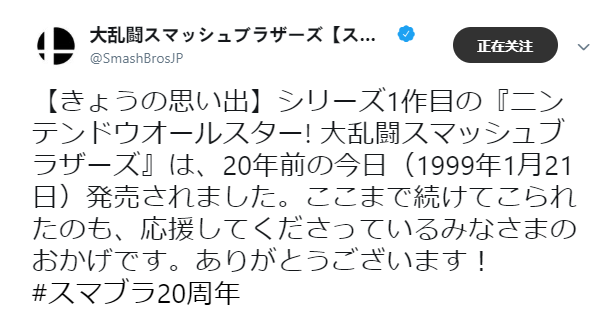 20年前的这一天(1999年1月21日),初代《任天堂明星大乱斗》正式发售。非常感谢大家忠诚的陪伴,没有你们的支持,这个系列也不可能延续到今天。非常非常感谢大家!