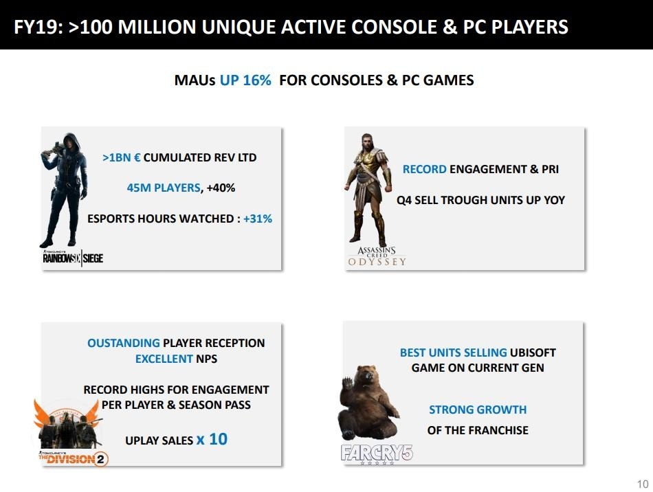 由于手游端份额上涨,PS4 从42%下降到36%,Xbox One 从23%下降到20%,Nintendo Switch 从7%降至6%,其余的游戏主机——包括 Xbox 360 , PS3 ,Wii 和 Wii U 在内本年度一共贡献了2%的收入。需要特别指出的是,今年育碧游戏在 PC 上的增长可以说是非常的喜人,其净收入增长了近79%,占到了该公司全年总收益的27%;在本年财政年的最后一个季度,PC 超过了其他所有游戏平台,占到了净收入的36%。