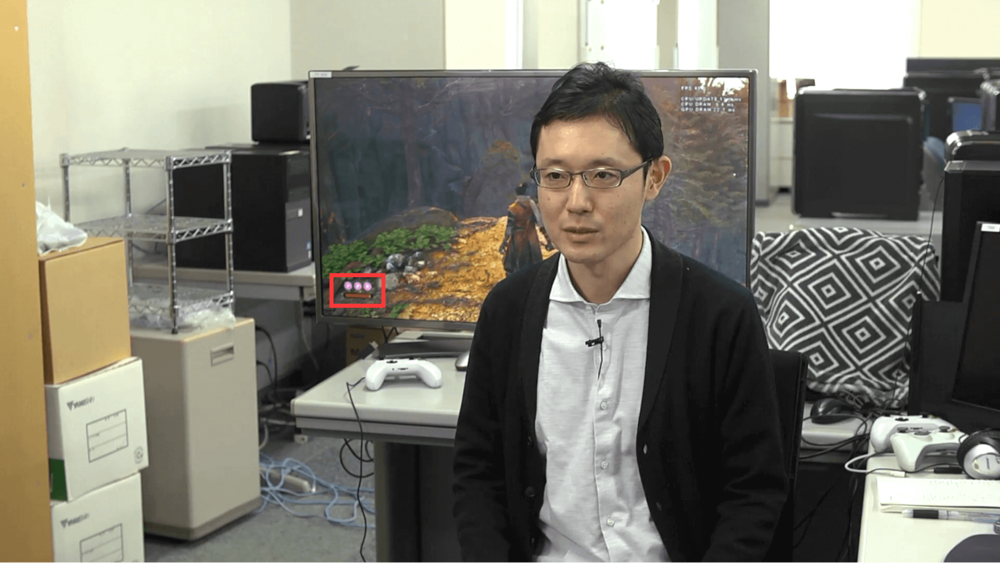 采访视频中有一个细节值得关注,在 Takasuke Ando 背后的电脑中,可以看见主角只狼拥有三个技能(粉红色的圆),试玩中默认配置了两个,所以这个地方可能就对应之前提到过的技能树系统。