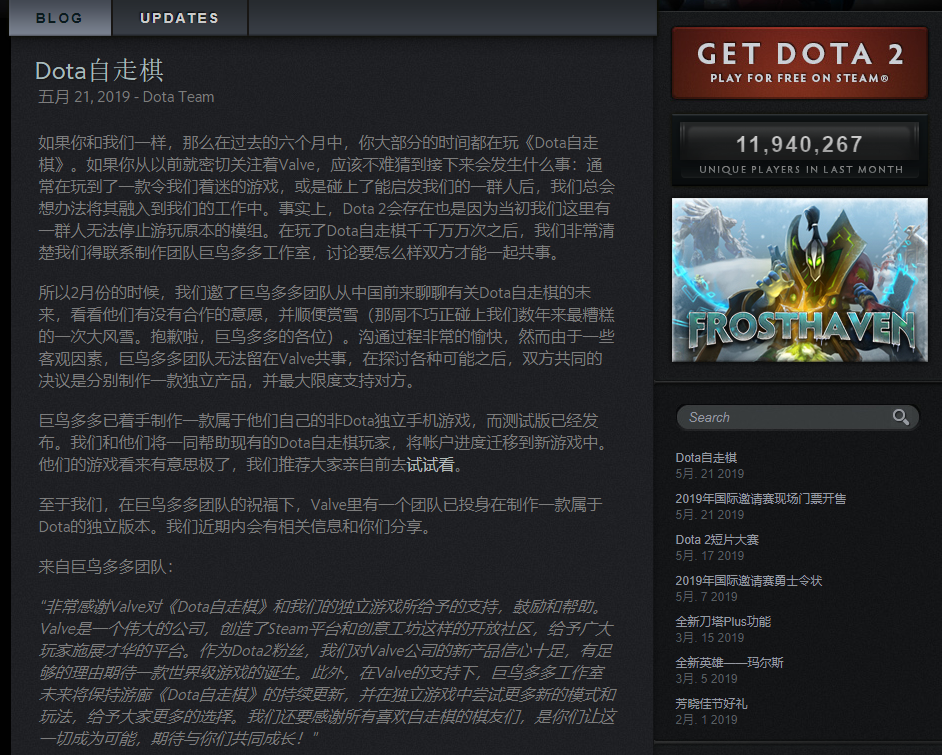 今天,Valve 在 Dota 2官网发布了一篇 Blog。宣布将开发独立的“自走棋”游戏,并谈到了和巨鸟多多在2月的洽谈。虽然双方没能达成直接合作,但他们将分别制作一款游戏并最大限度的支持对方。其中V社表示将帮助巨鸟多多,将目前现有的 Dota 自走棋玩家账户迁移到手游版的独立“自走棋”游戏中。而且十分友好地贴出了《自走棋》的官网,并评价其“有意思极了”。