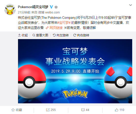 另外,宝可梦公司(@Pokemon精灵宝可梦)同样在今晚通过微博宣布,将于北京时间5月29日早九点举办“宝可梦事业战略发表会”: