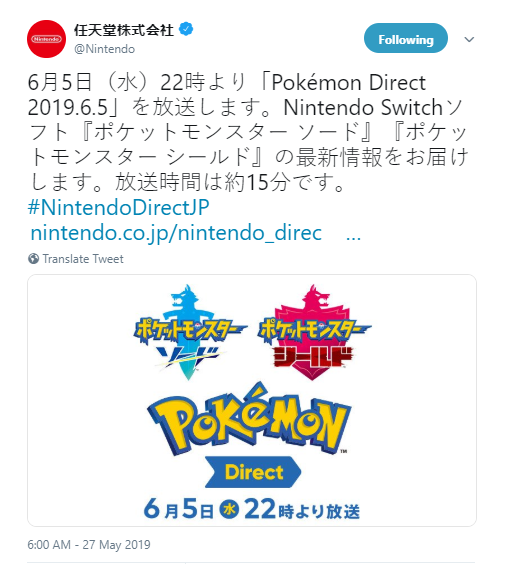 今晚,任天堂通过其官方推特宣布,将于当地时间6月5日晚十点、北京时间同日晚九点举办 NS 版《宝可梦 剑/盾》直面会,将介绍这款游戏的更多内容,直面会时长约为15分钟。任天堂官方推特截图如下: