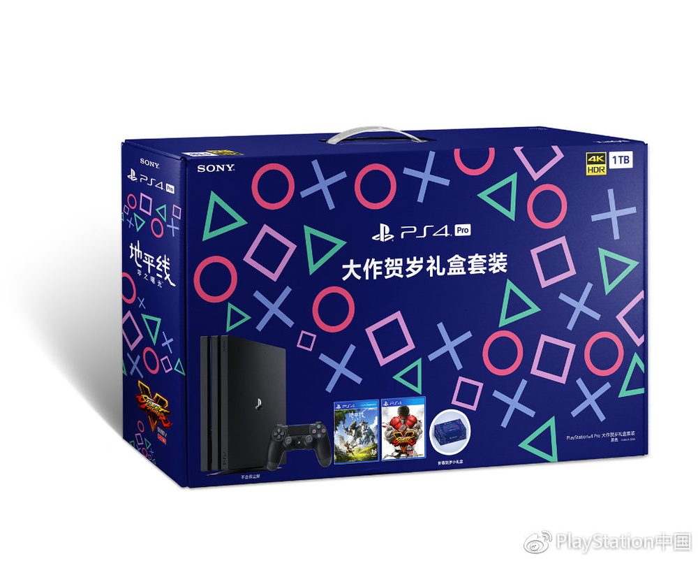 “PlayStation®4 Pro大作贺岁礼盒套装(黑色1TB)”包含PlayStation®4 Pro(黑色 1TB)主机一套,《地平线 零之曙光™》标准版游戏软件一张,《街霸V 入门版》游戏软件一张,附赠新春贺岁小礼盒一个(内含LED数码声控木头闹钟+主题酷彩纸手表),单品建议零售价总和为3,247元人民币,活动价2,799元人民币。