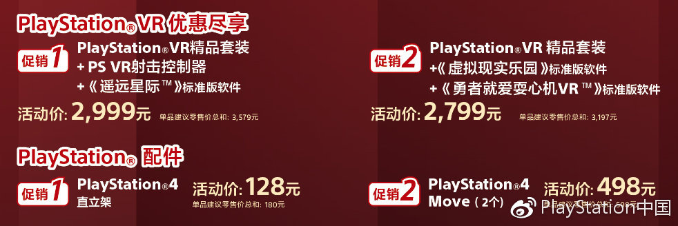 PlayStation®VR优惠套装一包含PlayStation®VR精品套装一套、PlayStation®VR射击控制器一个、《遥远星际™》标准版软件一张,单品建议零售价总和为3,579元人民币,活动价2,999元人民币。